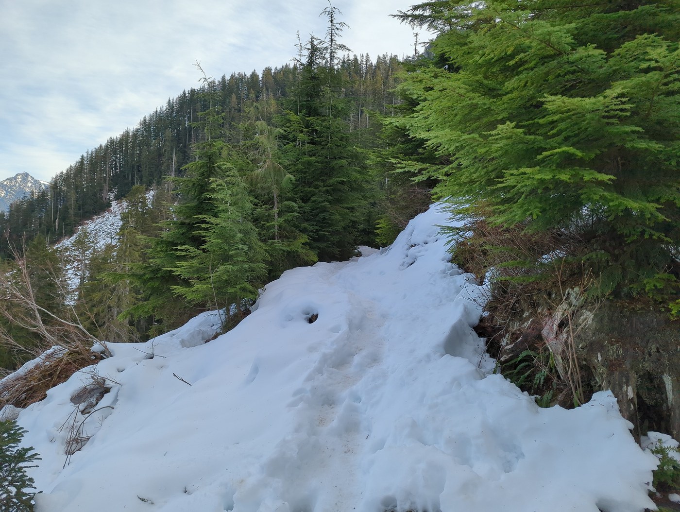 Ice crusted snow on the open slope just before the lake but (IMO) not worth the effort of putting on microspikes. Otherwise no traction thoughts/concerns. Having a hiking pole was helpful on the descent, there's lots of water crossing the trail and some of the rocks were slick. Gaiters helped with the stream crossings as well.