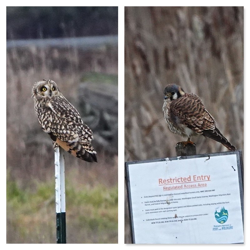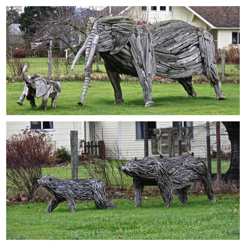Our oldest son, David, who lives in the Boston area is visiting and we took him to the Skagit area hoping to see snow geese which he has never seen. Unfortunately we didn't see any, but it was a good outing with rain waiting until almost dark to arrive. We began by visiting the Hayton Reserve where we saw two bald eagles in the nest tree along the entry road, a heron, an immature eagle on a stump, many, many ducks in the distance and thousands of shore birds flying overhead and in the distance. It was an outgoing tide when we arrived. From here we drove to the East and West 90 seeing many swans in the fields and eagles in the trees. At the East 90 we saw a short-eared owl, a kestrel, eagles and a few Northern Harriers. We drove to the Worline Road in Bow to see Joe Treat's driftwood sculptures in his yard which are always a "treat" and often changing. I will add a link below with information about him. When we are in the area, we like to go to Jimmy's in Stanwood for their delicious pizza before going home. Before going there, we went to Leque Island to walk the short trail there. It was low tide and getting dark so there were no photo ops, but it was a pleasant walk.