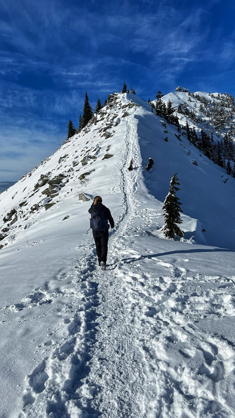 Absolute perfect conditions! Hard snow pack, low winds, established and clean boot trail up the winter router, and sunny blue skies. Took about 4.5 hrs, just microspikes needed. Snow level is ~4,200ft. But this will quickly change with the incoming precipitation. I think we caught a perfect window. Incredible hike!
