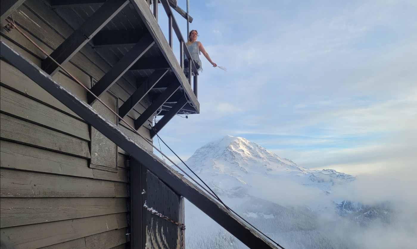 The gate is closed o Mowich Lake rd, just passed Paul Peak Trailhead. I drove my Kia Soul and used the parking at Paul Peak TH, having no issues with the drive. There was only one truck there before me. Yes there is giant potholes, but all were easy to navigate, knowing where my tires are. The was no snow, until about half mile passed the gate, and it was melting off leftovers. So weird. I was following what appeared to be 2 men's boot path, so I figured d see them coming down at some point. By around 2mi, there was probably around 4 inches of snow. I took the Grindstone route up. A couple muddy spots, but in relatively great condition. Once I hit the final stretch of Mowich Lake rd, I switched to snowshoes. I enjoyed a little visit down to the lake and further along the shore before turning around and heading toward Tolmie. I was at just over 4 miles for the start of that. I also switched back to boots for the next part of the hike. Coming up on Eunice, snowshoes were again necessary, and that's when I finally ran into the 2 gentlemen coming down. I then knew I probably had the rest of the day to myself. I snowshoed a big "NEW YEAR" into the snow at Eunice lake and headed up for the lookout. It has been pretty cloudy most of the day around Tahoma, But it cleared for me, just after arriving, and just before sunset. the mountain was SO CLEAR!! It was also of course quite windy and very cold up top, but I still opted to switch into my NYE dress for some photos 😂 my phone died and I was freezing so I packed up to head down while the sun was setting. It was absolutely gorgeous down on the switchbacks above Eunice. I also couldn't see my "NEW YEAR" in the snow below because I took too long getting up top and it was all shaded, dangit.