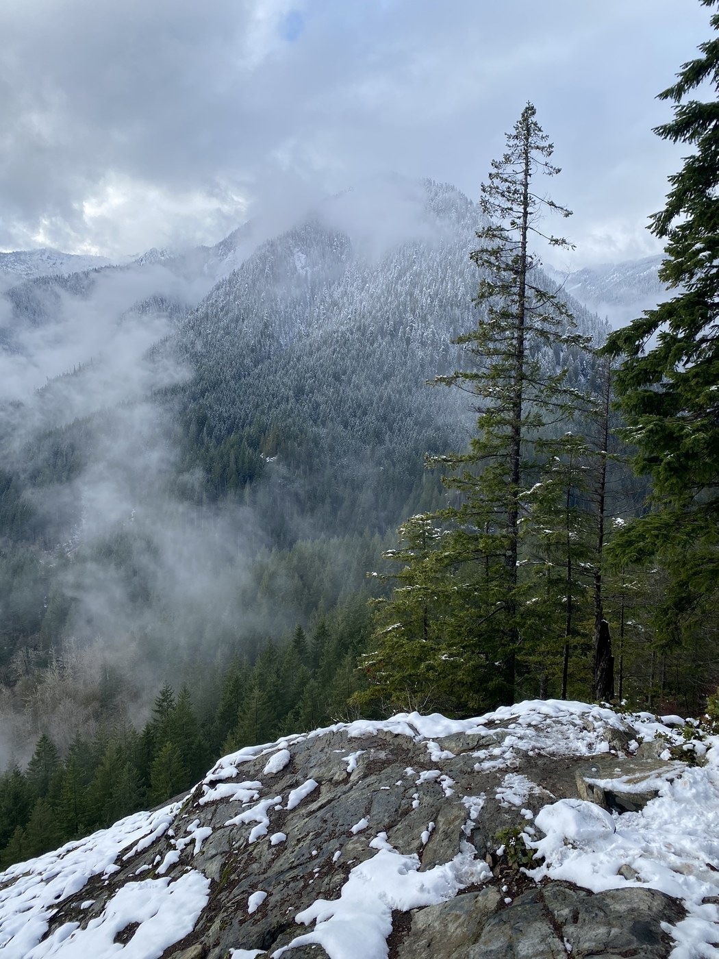 This was a great post New Year Hike. Still quite manageable and only a dusting of snow on the trail. The trees were dripping on us most of the way and they view was off and on due to dense clouds rolling up the valley. All in all a great outing for early January.