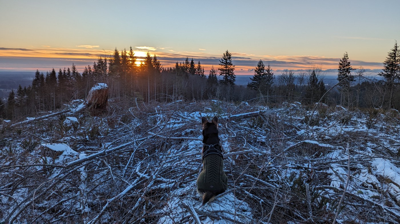 This was my second time hiking at Taylor Mountain and I've been pleasantly surprised both times. All of the trails that I've been on have been nice and very well maintained. Lucked out and timed it pretty much perfectly for sun on the way up to Holder Knob, sunset views up in the clearcut and fading colors while running down. GPS track below.