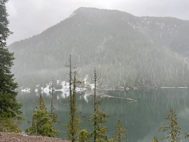 the trail is in typical “winter” conditions. Very wet, but no snow at all on the way up to the lake. No snow at the overlook.