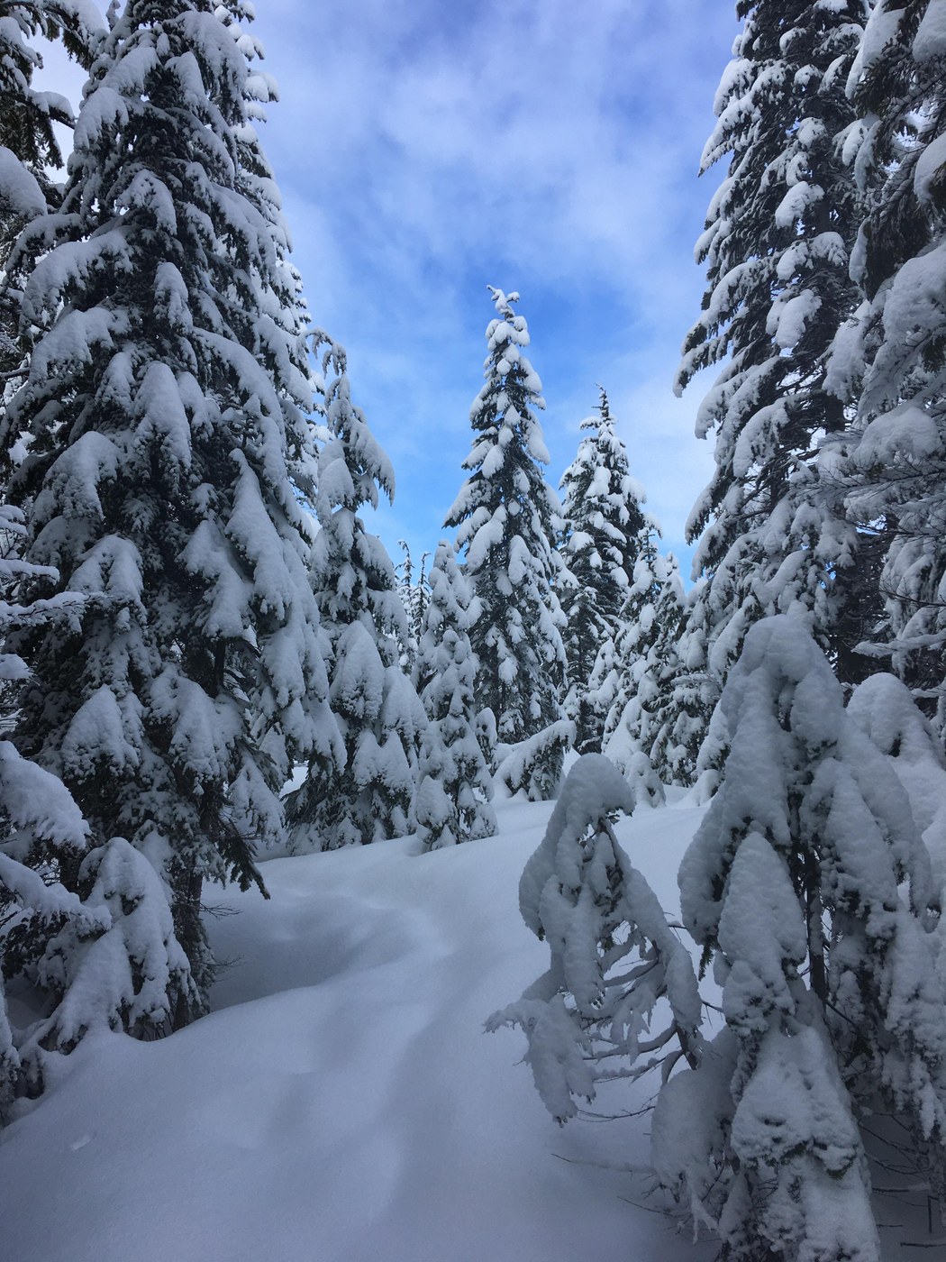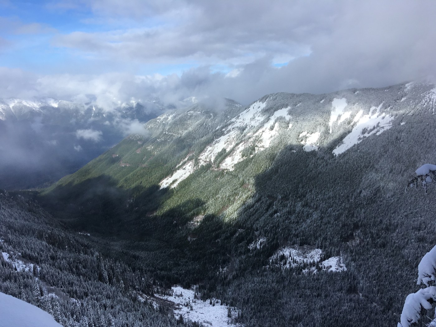 There was about 3-6in of snow all the way up until the last couple climbing sets of switchbacks. It increases gradually, with it being several feet deep at the "top". I did follow some orange flagging past this point to a nice view north into the Middlefork, high above Granite Lakes for a cold lunch. Looking south was socked in solid most the of the day.