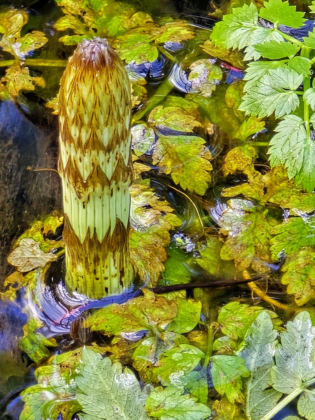 Photo 4 is one of the fertile horsetail stems emerging on the swamp trail amongst the water-parsley. From wikipedia (link below) - (Horsetail) has separate green photosynthetic sterile stems, and pale yellowish non-photosynthetic spore-bearing fertile stems. The sterile stems, produced in late spring and dying down in late autumn, are 30–150 cm (rarely to 240 cm) tall (the tallest species of horsetail outside of tropical regions) and 1 cm diameter, heavily branched, with whorls of 14–40 branches, these up to 20 cm long, 1–2 mm diameter and unbranched, emerging from the axils of a ring of bracts. The fertile stems are produced in early spring before the sterile shoots, growing to 15–45 cm tall with an apical spore-bearing strobilus 4–10 cm long and 1–2 cm broad, and no side branches; the spores disperse in mid spring, with the fertile stems dying immediately after spore release. It also spreads by means of rhizomes that have been observed to penetrate 4 meters into wet clay soil, spreading laterally in multiple layers. Occasional plants produce stems that are both fertile and photosynthetic.