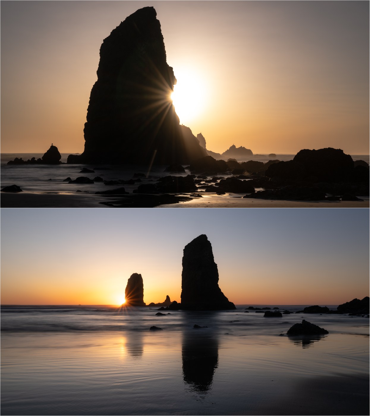 - Trail: From the Hug Point parking lot, head north (right) to find a waterfall and set of caves ~0.5 miles up the beach (see video); the waterfall would be very photogenic at sunset, but we had our sights set on Haystack Rock! From Cannon Beach "downtown", hike south to Haystack Rock ~1 mile, and then as far south down the beach as you like. Hard-packed sand makes for easy walking at low tide. The park rangers are setup around Haystack Rock protecting the tidal pools and nesting sites from overzealous tourists that might be tempted to climb all over the rock. Starfish and sea anemone can be found in the pools.