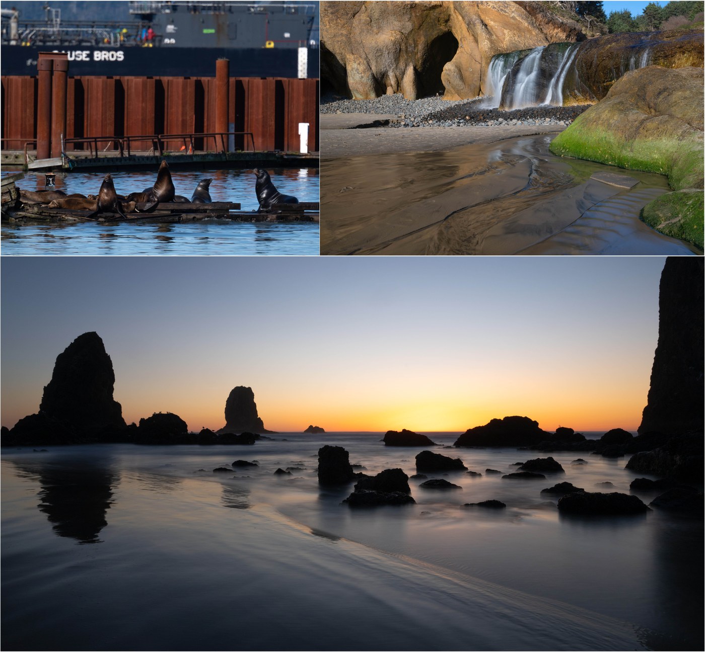 Cannon Beach, OR is ~45 minutes south of the Astoria bridge linking Washington and Oregon states over the mouth of the Columbia River. Having done a number of area hikes on both sides of the border in the past few days (Ecola State Park, Cape Disappointment, Kalaloch Beach) we spent our last day hiking to Hug Point and enjoying sunset at Cannon Beach. This beach is popular for good reason - beautiful sand, surf, sea stacks and the iconic Haystack Rock. Sunset was truly magical. Not as warm as summer but certainly a lot less busy!