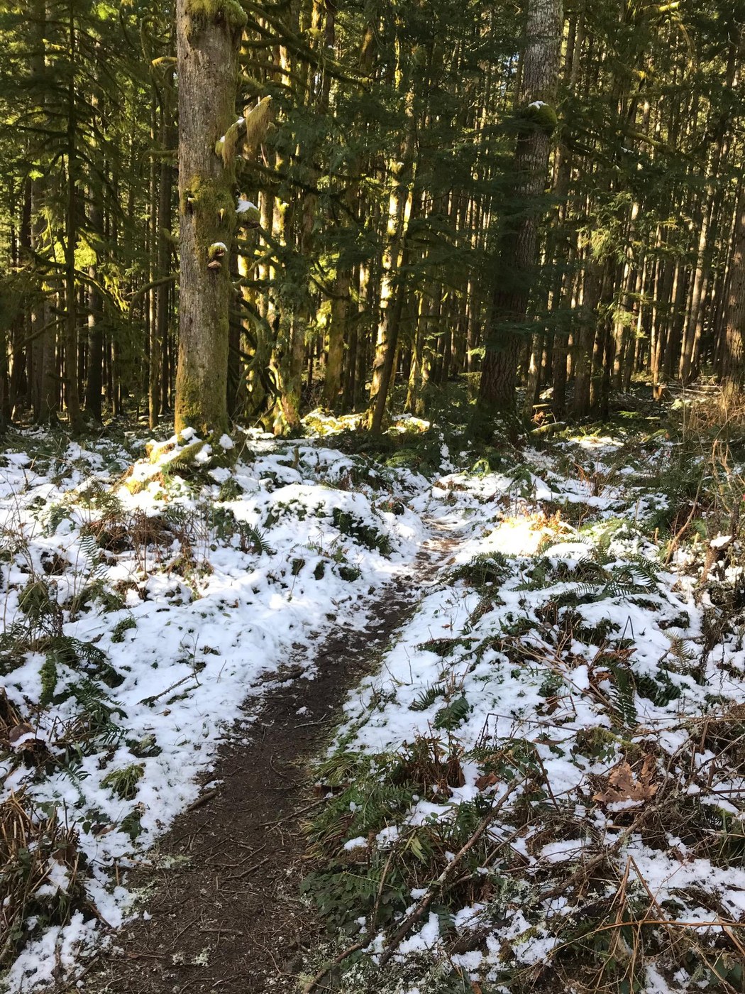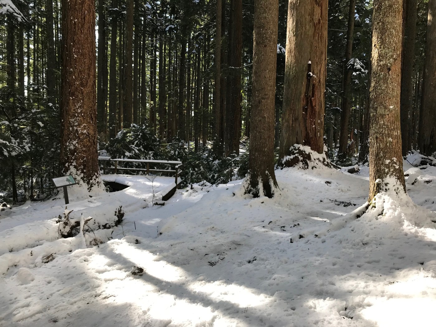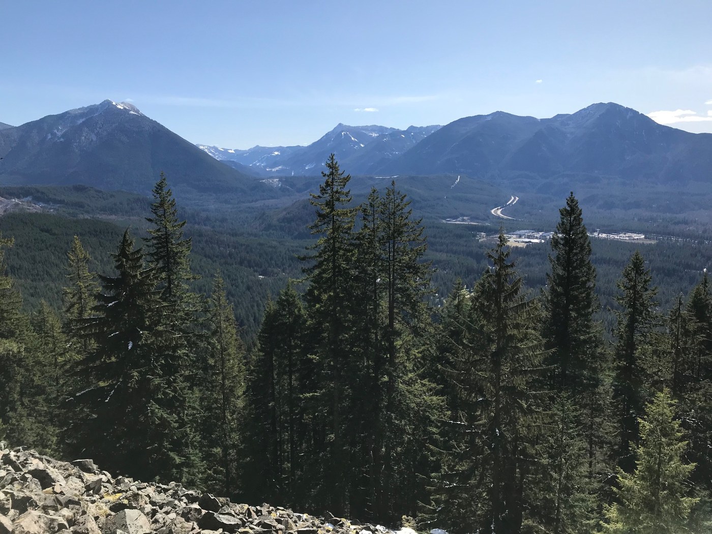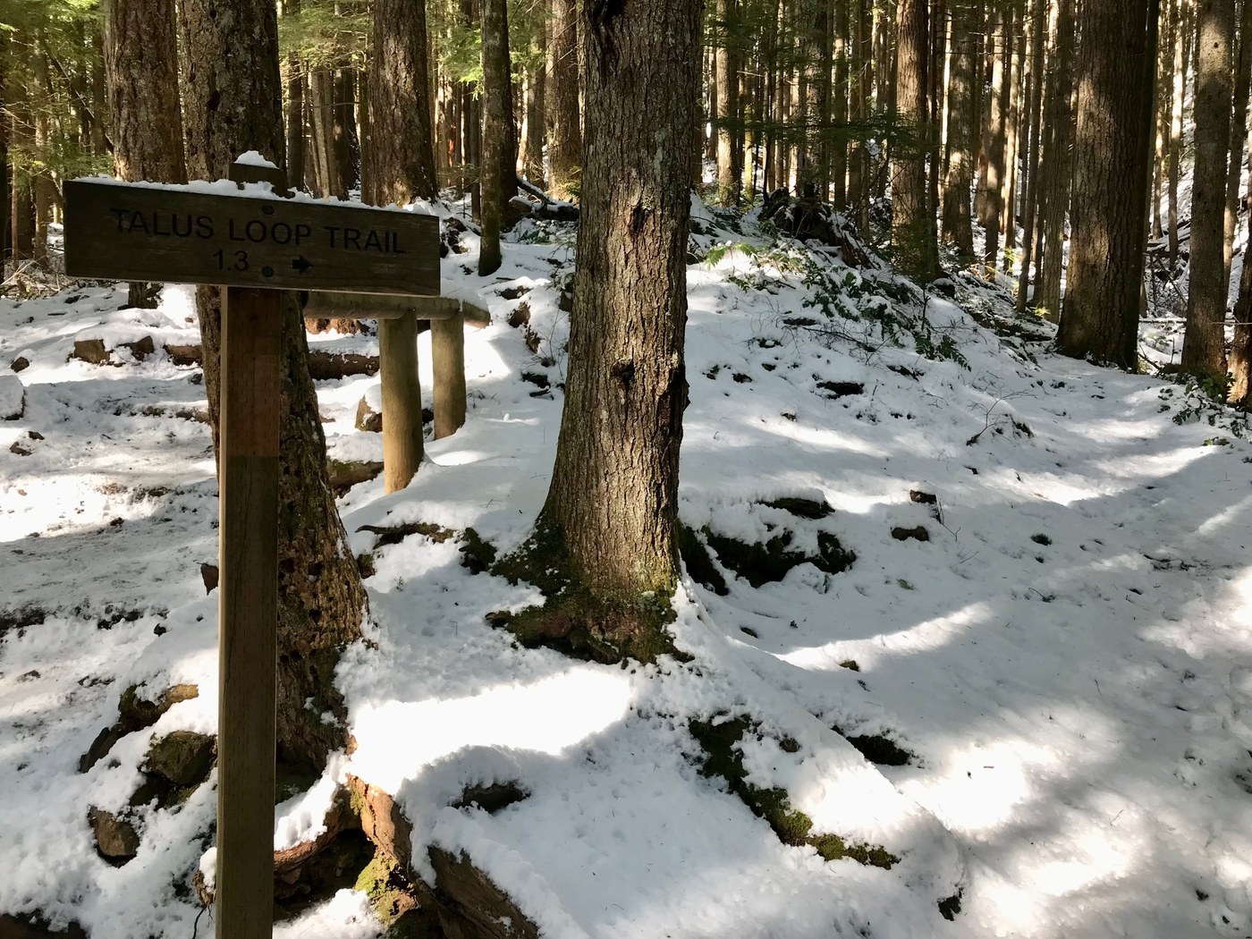 I fashioned a loop trying to stay on the sunny side of things. Up the Mount Ten road-trail then across Roaring Creek to the Mount Si main line, up to Snag Flats then back down and around the Talus loop, then back across Roaring Creek etc etc. Initially the trail was snow free, trail side snow showed up at the first junction up to the falls. The first three bridges of the Mount Ten road-trail had snow and ice but the actual trail was clear all the way over to the Mount Si main line. Snow showed up for real on the trail somewhere between the Doug Fir intersection and Snag Flats. It was compacted but my momentum was so slow I had to put my spikes on to make the steeper grade/steps. Snag Flats was gorgeous with full snow coverage. Backtracking I wasn't sure what I would find on the Talus loop. It's a rougher trail for sure so I kept my spikes on until I reached the rock overlook where the snow disappeared. I stopped here for a snack enjoying the view and more wonderful warm sun. Then without spikes I was fine traversing the on again off again snow patches of the descending loop. The trail was still easy to follow, although I was startled by a couple of bigger snow/ice bombs.