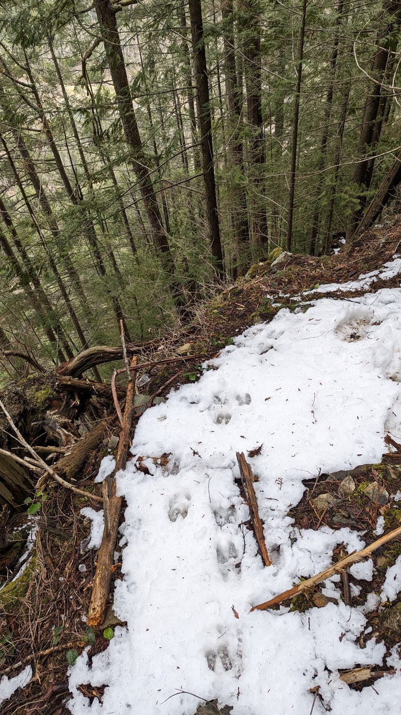 Mountain goat tracks all over the place. I saw one mountain goat on a ledge right above and heard more of them. Followed their clear trails up for the majority of the hike and walked by a few of their sleeping areas too. Some of the trails were packed down well enough to be noticeably helpful.