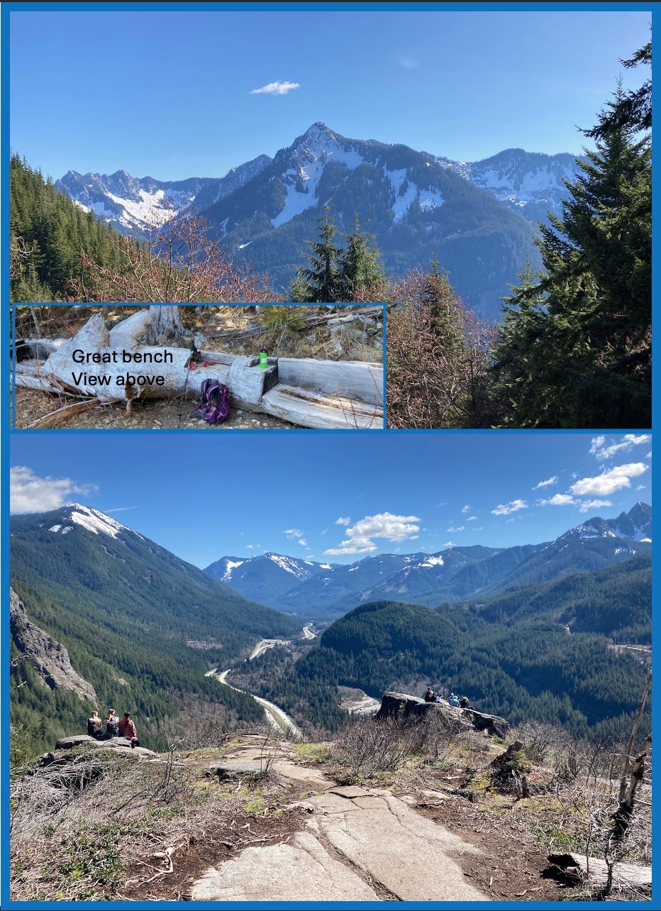 I took the left, the abandoned road; there is an initial almost flat traverse through a vine maple area (with no leaves yet, there are views), across an open talus with great views, and then the abandon road starts to climb and so typical of Harry's approach to road building, steeply and occasionally even more steeply. Often the trail along this road wanders from one side to the other in both an effort to by-pass obstacles and to create less of a gradient for the hiker. The latter was greatly appreciated. Gained about five hundred feet and then it crosses a stream that has a main channel, but with high flows, also several active channels. The crossings just took a careful eye and occasional giant step. The museum is reached, but I had seen Harry's stuff back in 2006 and did not need to see it now. The road continues up, switch-backs using some giant flat granite slabs around the corner. Reaches the great view point and associated resting log (Figure 1). Up (never flat or down) and then a switch-back at the base of a giant talus (~3,450 ft), switch-backs with a few signs of snow, more steeply up, another switch-back and more evidence of snow and some covering the trail, more steeply up and another switch-back (~3,700 ft). Now the trail was consistently snow covered and the snow was getting deeper quickly as elevation was gained. I put on the microspikes and was instantly happy with my decision. The up becomes sufficiently steep in places that I either used someone else's steps or kicked my own. Around 4,350 ft, the trail is now weaving back and forth and is very steep (I discovered coming down). Finally a ridge is reached, the track is relatively gentle, the views are through gaps, and a high point is reached with views down to still mostly frozen Granite Lake.