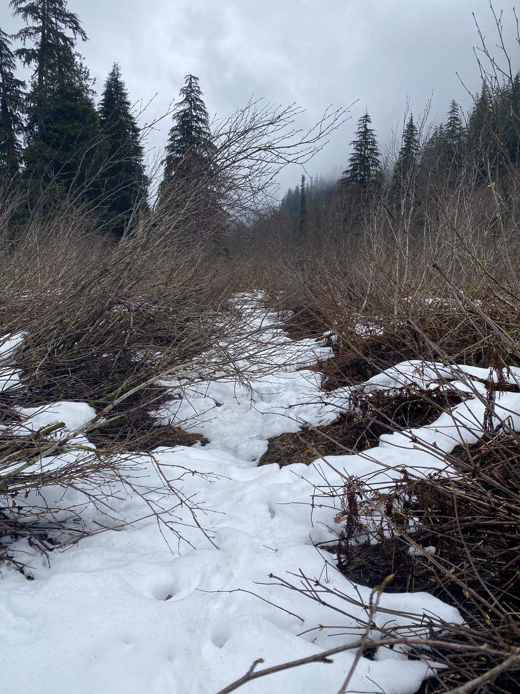 Between the snow getting under my gaitors and into my shoes and the trail being obscured by both snow and vine maple folded over into the snow, I had to turn around 4miles in. Due to the vine maple, even snow shoes probably wouldn’t have helped.