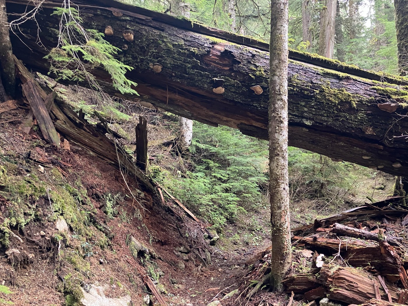 when you get to the trailhead it’s like an apocalyptic scene. There is a massive, and I mean massive tree that came down and it obliterated nearly everything in the parking area. The signage and stuff still stands along with the toilet that is there. The trail has an abundance of down trees over it crawl under walkovers and walk arounds. It’s not absolutely horrible but it’s not ready for prime time by any stretch. We need to get a crew up there to spend a day or two cleaning it up a wee bit. The plan was to make it to the bridge and our pace was really good on the trail. It was driving on the mountain loop highway and the access road to the trail that did us in for the day because it ate up so much time we knew we had to conserve time to get back to civilization before dark. Over all I think it would benefit everybody if whoever manages the Mountain Loop, Highway would post the status, pothole and rut, wise and washout wise of the highway. calling it a road is a stretch. It’s just a constant rut. I’m fully aware that it is winter time / off season for the most part on the mountain loop highway, but maybe a sign at either entrance, describing the conditions of the road currently like someone would with a fire danger warning sign could really help. Nobody wins when a vehicle gets stuck or breaks down due to road conditions and I understand that it’s buyer beware but we could help each other out quite a bit by better communication. Overall, I would highly recommend staying away from the Mountain Loop, Highway until whoever it is that decides work can be done and should be done gets the work done to improve the conditions