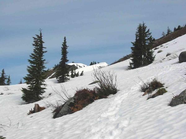 Almost seemed like early summer along the lower 2/3 of the trail with warm sunny skies and hardly any snow to notice. Big clue that it really wasn't quite summer were the trilliums as they gasped their last breaths. Beyond the 3/4 point - as you start to head in the direction of the look out (see picture) - the trail cowered beneath solid snow. In the early morning it was solid, frozen, hard snow (based on other trail reports, the snow becomes much more comfy and stompable later in the day). Since I left my poles sleeping in their closet, I chose to go only a short distance across the snow - far enough for a few quick glissades on the way down. Saw only three other hikers on the trail - all of whom must have started soon after I had. Didn't see anyone else until I was back in the parking lot at 10 AM.