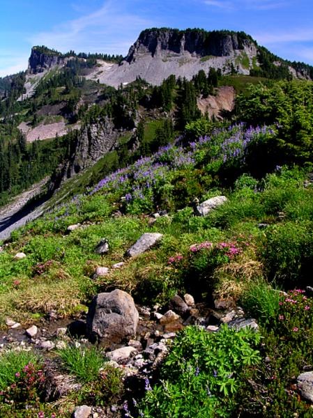 The trail more or less contours a hillside to a junction with the Chain Lakes trail, which drops to the right. After a short bit, the trail drops a few hundred feet to round a rocky face and does a short climb and short drop through mossy streams and monkeyflowers. The trail enters a rocky ""meadow"" and splits below the ridge top it is aiming for. We headed right and where we could have followed the path, headed right up a soft and not steep snowpatch and regained the trail on the ridge.