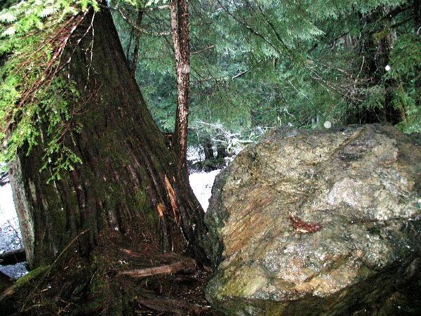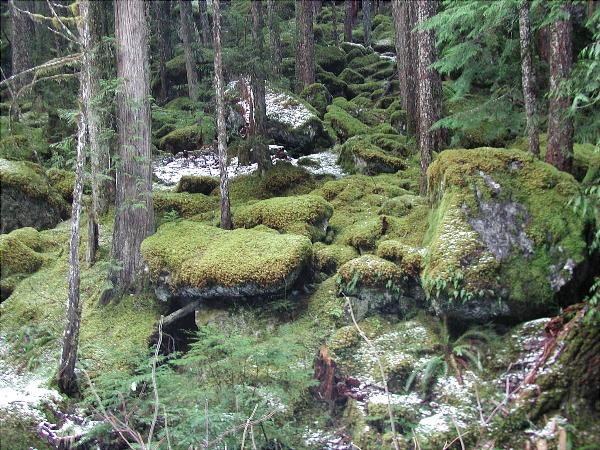 By now it was almost two pm, so we headed up into the Valley of the Silent Men, following the underground course of East Fork Lena creek. The VOSM is awesome. Moss, moss, and more moss. The steep valley sides make it seem like the other side has been tilted up vertically as if on display for us. Another bridge over a dry channel is reached, with the stream underground again. It was hard to make time on this trail, as there are cool things to look at about every five feet. Giant boulders that have crashed down onto giant trees, the unearthly stillness of a steep-sided valley carpeted on every surface by sound-deadening green shag carpet, a peek at a peak up an avalanche chute, a detour down onto the river bed to bypass trail damage, all caused us to stop, marvel, or photograph. At 3:45 we reached a nice, slightly off-trail gravel beach along the now-surfaced creek. It was very cold, but we had lots of warm clothes, so we took a long rest, and consumed some banana rum, and fed pistachios to the dog. The GPS said we were at 2,400 ft and four miles from the car, by trail, not straight-line. That seems right.