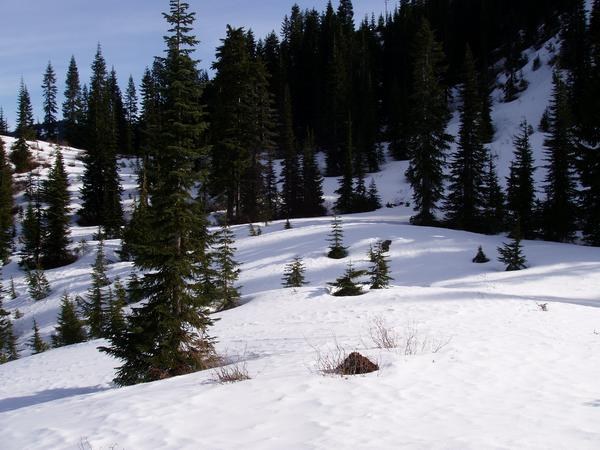 Stayed right heading up the ski runs next to tree line and headed up to top of the lift area.