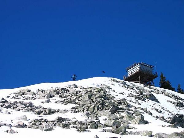 Took the ""Summer"" route since laziness meant following the packed trail around to the north. That wound its way around and up and finally just made a beeline for the Lookout. It was quite firm in places, particularly on the way up when it was still pretty solid. There was definitely a hardy wind blowing. Took shelter in some trees on the west side of the lookout and it was sunshine and pleasant. The wind was refreshing on the way up but not so once there. Ate, drank, chanced into a dry shirt and gawked at the lack of snow in general. The snow was more yielding on the way down but my ice axe was a comforting companion.