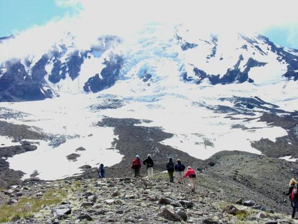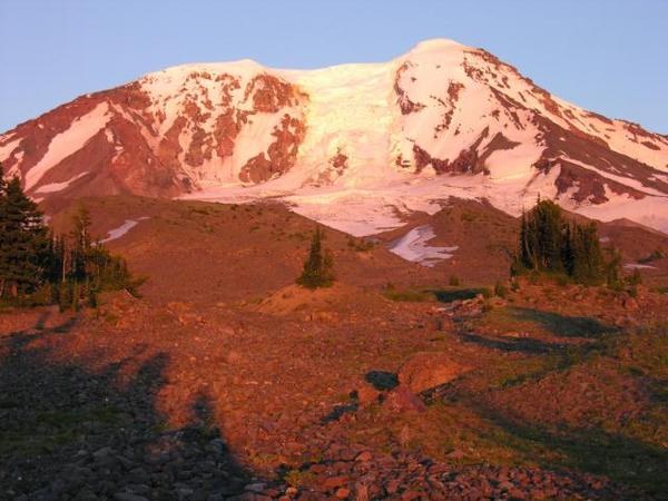 Mount Adams Wilderness Backpack, July 15-17, 2005 Wildflowers were at their prime as six members and two guests of the Trails Club of Oregon spent three days backpacking in the Mount Adams Wilderness on July 15-17, 2005. Despite the lack of snow last winter, the rainy spring and early summer have ensured a lush wildflower bloom this year. We set up a car shuttle so we could do a ""hike through"" from Divide Camp Trail #112 to Riley Camp Trail #64. We spent two nights camped off trail at timberline on the headwaters of the Lewis River, using the middle day for cross country exploration of Adams Glacier, its moraines, Glacier Basin and High Camp, returning to our campsite via High Camp Trail #10 and the Pacific Crest Trail #2000. On our final day, we hiked cross country to the PCT, then south on the PCT across the Mutton Lava Flow to the Riley Camp Trail junction, stashed our packs off trail, and took a side trip to Crystal Lake, an off trail subalpine lake in a bowl about 200 feet above the PCT. We returned to our packs and descended to Riley Meadows, an old sheepherder campsite, for lunch and final views of Mount Adams before descending through forest back to the road. We did have mosquitoes; they come hand-in-hand with the wildflower bloom. We also had some challenging stream crossings in the afternoons, as snow and glacier melt turned Adams Creek, the Lewis River and Riley Creek into torrents. On our first night, Mount Adams was brushed by the southern edge of a cold front that dumped rain on hikers further north, but only brought us clouds. The second day, we experienced continuous clearing, leading up to clear skies and a fabulous sunset on the second night. The third day was sunny and warm as we hiked out, ensuring a stop at Trout Lake for huckleberry smoothies and rootbeer floats on the way home.