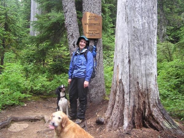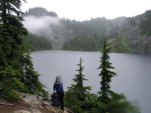 Well, a little rain in the city wasn't going to discourage Sadie from taking a trip up to some choice location in the Alpine Lakes. Stopping to pick up (two-legged friend) Julie and (four-legged friend) Zoe in North Bend, we all figured that the rain wouldn't still be falling by the time we got to the trailhead for Rachel Lake. Wrong. There were about 4 cars in the parking lot and one that pulled in behind us. A young woman by herself got on the trail but would soon be discouraged from continuing - as she only had on shorts and a very light rain jacket. She had the same idea we did that the weather would clear. She made it up about a mile or so and turned around. The trail is very overgrown - and the falling rain only made it worse. We were getting drenched from above and from below! The trail through the meadows was nothing more than a ditch with about an inch or so of water. One couple was headed out after what was probably a wonderful backpacking trip until they woke up this morning! But about 10 minutes later, we had a ""first"" experience. Now, Sadie and I aren't nubbies on the trail, but this had to be real initiation for us. This tall guy with a backpack and dog was heading down the trail towards us - however, it seems that he didn't want to get his shorts or rain pants wet while traveling through the overgrown trail and, yup, you got it, we got the Full Monty! Ohmygosh. His long-sleeved shirt didn't hide a thing. We concluded that the Ranger would probably write him up for traveling without a permit. Just be forewarned, there are interesting hikers out there - not always a good, family experience. After that incident the rest of the hike to the lake was pretty tame. The trail is muddy and slippery all of the way. There are lots of roots to watch for. At least the bugs weren't around. Sadie and Zoe thought it was all good - wet is wet - and they got into every bit of standing water they could find, capping it off with a swim in the lake. We scrapped our plans to walk up to Alta, we were soaked to the skin, but managed to keep our hiking clothes on, opting for dry things once we got back to the car. The return trip to the car was (mercifully) uneventful. There was only one car left in the lot when we returned - probably someone who decided to stay in their tent today!