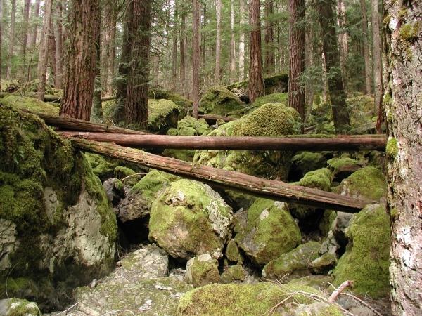 On Tuesday morning, we (Daisy and I) awoke (at the Elk Lake trailhead) to fair skies and warm temperatures. A leisurely breakfast, a short drive back to the Lena Lake TH, and we were hiking again. This trail also (like the Duckabush) starts off easy but plain, and then gets better and better. The trees get huge, the moss carpets everything, giant boulders tumbled in heaps, you cross an underground river on a bridge (really!), and eventually reach Lena lake. The lake is nice but not great. The wind had apparently just changed direction, as the driftwood was drifting like crazy. It was very pleasant to look down on the lake from the view cliff about 1/2 way along, letting the sun warm my back. After about an hour, Daisy was restless to hike some more, so I humored her, and we headed towards the Brothers wilderness boundary and the Valley of the Silent Men (cue spooky music).