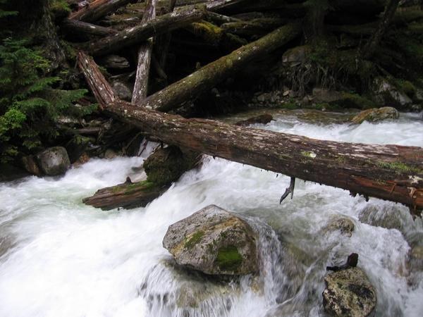 With a serious torrent barreling down Bachelor Creek, crossing it at the very end of the hike is extremely scary right now. Wading is a frightful proposition, at least knee deep in very fast water. The only log across Bachelor Creek is a good 4 feet above stream level, and the prospect of falling off into 2-3 feet of rushing mountain stream is a bit much (won't be repeating). Fortunately for the return trip we discovered that scooching over the log on our butt feels much safer. In any case, doing this crossing made all the other crossings seem a cake walk on the return.