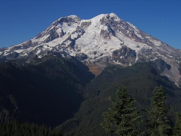 From Lake George, the trail heads northwest and slowly begins a 1.6 mile ascent to the tower. After a few switchbacks, the trail briefly levels off, then another series of switchbacks begin. I encountered a couple patches of snow which were no problem to cross. Finally, an hour after leaving the lake (3 hours after leaving the car), I arrived at Gobbler’s Knob. The view is almost overwhelming. To the south, I could see (a very distant) Mt. Hood and Mt. St. Helens. Of course Mt. Rainier was totally unobscured. Van Trump Park, the mountain's west-side glaciers, and all nearby peaks were all easily in view. The tower was unoccupied.
