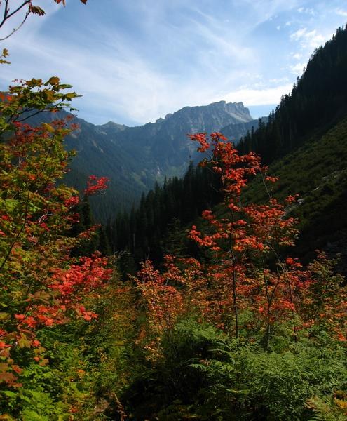 At about 5 miles you come to a river crossing over a long and stable log bridge. It is flattened on top and easy to cross. Follow the trail to another log bridge, much older, which leads to an old slide slope. Look for the cairns, but if none are found, head up to your right and you will run into the existing trail. Here you start to climb, and steep. I believe the books say about 2k feet in about 2 miles. It feels like it, but again, the beauty makes it bareable. Also, some of the scrub oak are changing color already, so you get a few short patches of beautiful color. By hitting this trail in the afternoon you also miss some of the sun, which helps to keep it cool.