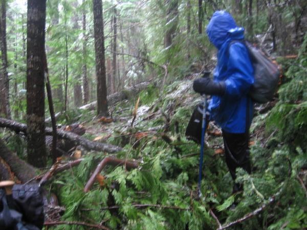 We set out to hike up to lower lena lake on this cold and wet day. Getting to the trail head was a bit of a challenge. We counted about 30 blow downs on the Hamma Hamma road. Each blow down was cleared only enough to open up one lane of the road. Driving to the trail head involved constantly changing lanes to drive around each blow down. I had to run over some rather large piles of branches and it was a bit dicey to run over such things in my little ground hugging station wagon, but I can say that the road is passable in a passenger car. There is some patchy snow near the trail head.