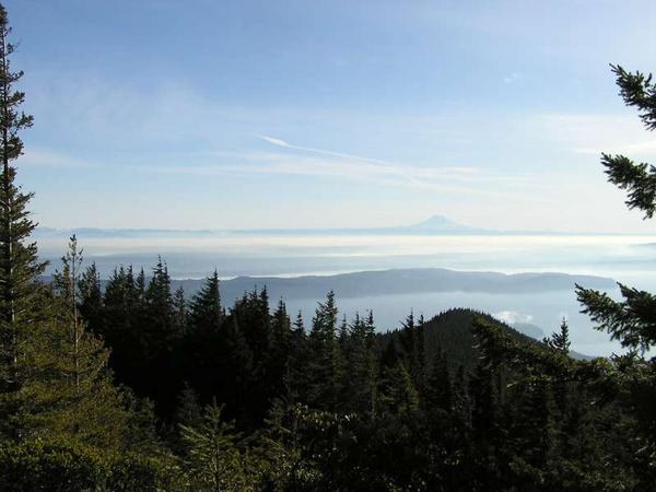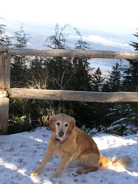 What a treat. Three straight days of hiking. Cousin Clover joined this morning's hike. Sadie is staying in Sequim this week, so the driver decided there must be a hike in the National Forest where Sadie and Clover could go. Sure enough. Five miles south of Quilcene, Mt. Walker awaits - accessible right on Highway 101. Since it was a little brisk this morning (nothing like at Stevens Pass yesterday - it was 20 degrees warmer this morning at the trailhead - a toasty 29 degrees). Since we were in no particular hurry, because the hike is only about 4 miles roundtrip from the trailhead, we got to the gate about 10:00 a.m. Two cars pulled in right behind us!!! The road is gated, but there's enough room for about 8 cars to park off of Hwy. 101. A couple with a dog started out ahead of us - it's about a 1/2 mile from the gate to the trail head. The other couple were still getting ready when we headed out. There will need to be some clean-up needed before cars will get back up this road. The road to the top of Mt. Walker is 4 miles long. From the trailhead, it's 2 miles - but however you do it, it's still a 2000' gain! Almost a Mailbox or Tenerife trip! Sadie, Clover and the driver left Kate and her owners at the trail register and we were off and heading up, up, up. It wasn't long, maybe a little more than a 1/2 mile, before the driver had to stop and take of the vest, the coat AND the hat! The layers that worked yesterday up to Lichtenwasser, were way too much for today! Plus, this would be a no nonsense hike today. The nice thing is - I didn't have to schlep snowshoes, because today was a total brown hike! The trail winds through a lovely wooded area with lots of wild rhododendrons along the way - bet it's pretty in the Spring. The trail switchbacks up the south side of Mt. Walker and ends up two miles later at the top of Mt. Walker at the northern viewpoint - somewhere you can drive when the gate is open - but this was so much more enjoyable. Views of the Olympics (Mts. Jupiter and Constance along with Baker) were stunning. You can walk from the northern viewpoint to the southern viewpoint - it's only a 1/2 mile and gives you a different perspective. There was a light dusting of snow on the top, but nothing significant. We took in the views from this exposure - lovely. As we made our way back to the north viewpoint again, we ran into trail pup Kate and her humans; and then the other couple was enjoying their lunch at the northern viewpoint. I quickly warned them that the thief (aka Sadie) was making a surveillance run, so they'd better be careful! She is known to grab a pb&j sandwich before you can say STOP! Anyway, they were kind enough to take our picture (Clover was being shy). Off we headed back down the trail. Ran into a solo hiker on his way up about 2/3's of the way down; and then on the closed road we saw another couple coming up. Stats: 3 hours car to car; 2000' gain in 2 miles (whew!) total distance: 6 miles. A great little hike. Sadie is resting comfortably in Sequim.