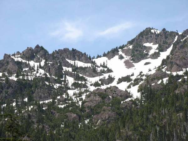 I and several other parties fussed around trying to find (successfully) the many bits and pieces of the summer trail interspersed with the nearly continuous snow. Reached the nice rock overlook (about 4700') for lunch, and descended thereafter. From there up the trail looks to be continuous snow up into the high basin and left across to the summit ridge. (See photo) I'd bet the switchbacks up the summit ridge are relatively clear due to southern exposure. Several folks with a bit more time in their day gave it a go.