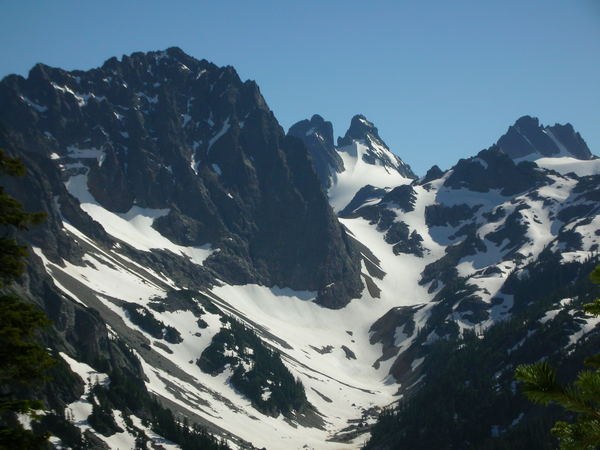 The route down to Williams Lake is passable with the snow line again about 4500-5000 feet. Beautiful camps at williams lake with outstanding vistas to the the nearby peaks: Bears Breast, Summit Chief and Chimney Rock. Even a few goats were grazing on the slopes. The Williams lake trail #1024 down to the Middle Fork of the Snoqulamie is sketchy from the lake shore as the snow is still melting out. Find the trail clear at around 4000-4200 feet. Route is clear with no blow down.