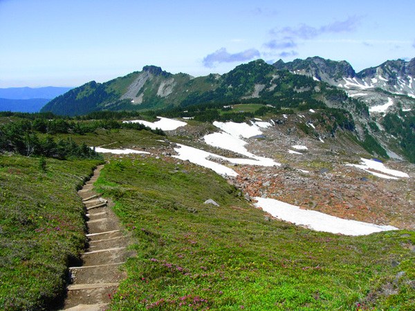 This is one of my favorite hikes. The trailhead is at Mowich lake at the northwest corner of Mt Rainier NP. The dirt road to the trailhead is in very good condition albiet dusty if your behind someone. The trail starts out in the woods for the first 2.5 miles. A 100ft side path to Eagle Cliff View affords a great view of Mt Rainier. The meadows are very green and are accented with Avalance Lillies, Paintbrush and several others. Just a few small snowfields near the trail highpoint. Head off on an easy crosscountry meander over moraine mixed with interesting alpine vegetation. Try really hard to only walk on the rocks and avoid crushing these delicate plants. A loop can be made by returning in the open valley dotted with small lakes just to the south of the main trail. A .1 mi side trail to Spray Fall is very worthwhile and is best illumiated in the afternoon. There is a bit of a scramble to get an unobstructed view of the falls.
