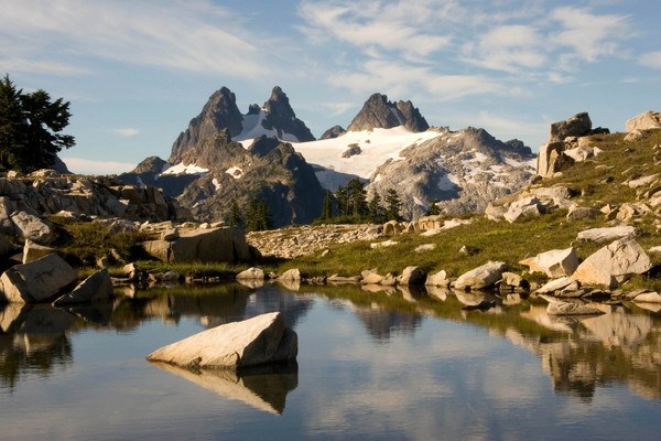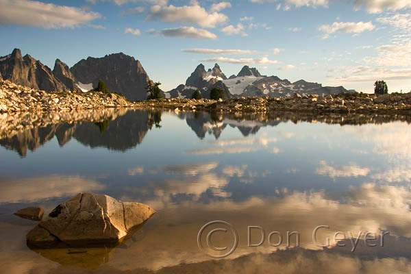 Saturday evening provided an excellent sunset with red blazing clouds to the west. Night brought a star-filled sky. I found it impossible to close my eyes as I lay in my open bivy sack. Alas, early morning saw the clouds begin to roll in. I awoke for sunrise, but there wasn’t a sunrise to be seen. A breeze was roughing up the water in Tank Lake. A short while after sunrise, the sun did succeed in finding a hole in the clouds somewhere and lit up Overcoat Peak and Chimney Rock. But this only lasted about 10 minutes before returning to gray skies again. Around 8:00 the sun began burning off the clouds and blue sky began to appear.