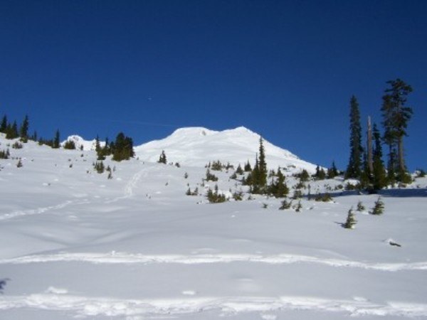 Beautiful day for a hike/snowshoe trip on the south flank of Mt Baker. The snow was firm in the lower elevations with a sparkle of hoar frost from the past several clear cool nights. It was as if the snow was covered with hundreds of tiny crystals. Up top, at the junction to the Scott Paul Trail, the snow had a nice soft layer to play in. The snowshoes were great for the upper region, but not needed on the rest of the well packed trail.
