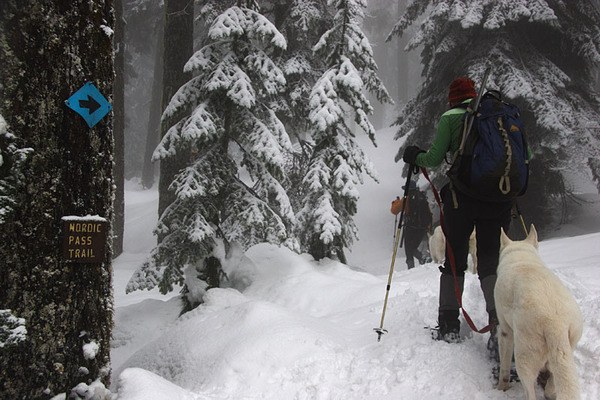 Part way up we found a broken trail which greatly sped our progress. We zoomed along to Hyak Lake and soon the ridge. From here we briefly lost the route but picked it up again after some wandering. It was then a slower walk to Nordic Pass when our broken trail fizzled out. Nearly there Emma the dog had some stomach issues and Joanna nearly had to turn back. But Emma's a tough old dog and pulled through the rest of the way on. At the pass we took a brief break. At least we assume it was the pass - we couldn't find any sign of the Nordic Pass sign.