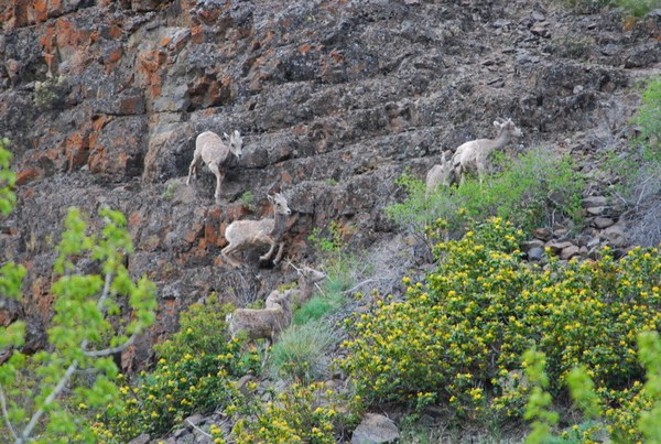 We hiked about 3 miles along Umtanum Creek Canyon. Wildflowers were just beginning--dark purple desert- parsley,lupine,larkspur. These were few and far between. The Balsamroot didn't appear to be near ready to bloom-just green leaves popping through last year's dead leaves. We saw many yellow- rumped warblers, a female hairy woodpecker being courted by 2 males, a beaver swimming into its home when it saw us, 1 lone bighorn sheep and then further along 6 playing on rocks across the creek as we began to ascend above the creek about 1/2 mile from the campsite at about 2 miles. This is a very pleasant spring hike.