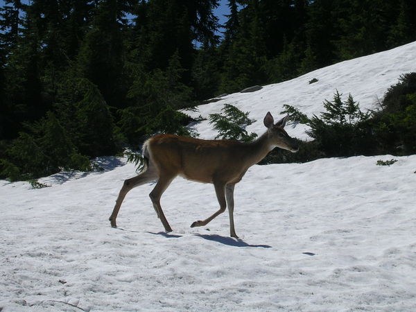 Trail in fine condition with a few easily passable snow patches near the Katwalk. Spring run-off waterfalls now easily passable. Katwalk itself snow free but beyond to Gravel Lake the trail is 50 % snow-covered and requires some cross-country navigational skills. A couple of nearly snow-free campsites near Gravel lake which is 2/3rds melted(ice still covers the south shore). Ridge Lake at about the same degree of melt-out as Gravel. Walked up on 2 small deer nibbling spring greenery just north of the Katwalk and tracks of a much larger deer(?) near the lake. Bugs not a problem for us but they were keeping the deer close company. Wild flowers out in all their splendor.