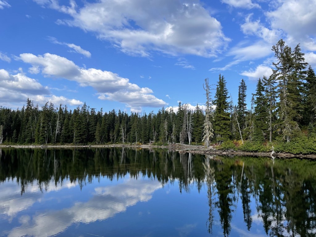 The trail crosses a coniferous grove before popping you at your destination, the scenic shores of Shellrock Lake. To the north, the tippy-top of Tumac Mountain is visible. A couple shoreline campsite invite you to take-a-load-off and enjoy this park like setting before heading back.