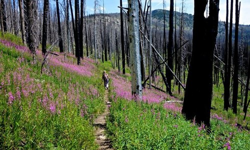 After a wildfire, what's left is a changed landscape that can make for a fascinating hike. Bright purple fireweed contrasts with blackened trees, and morel mushrooms occasionally poke through the duff. New green growth pops against an arid environment, and a new landscape is born.