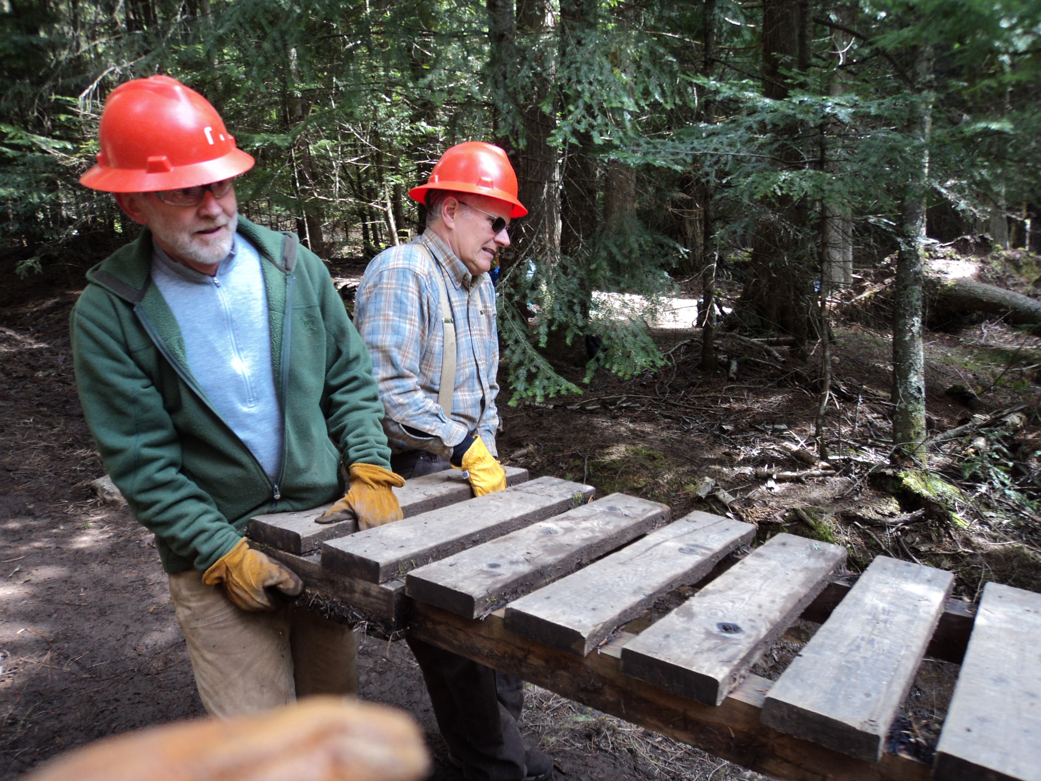 Volunteers finishing up a bridge across a section of the Liberty Lake trail. Photo by Jane Baker.