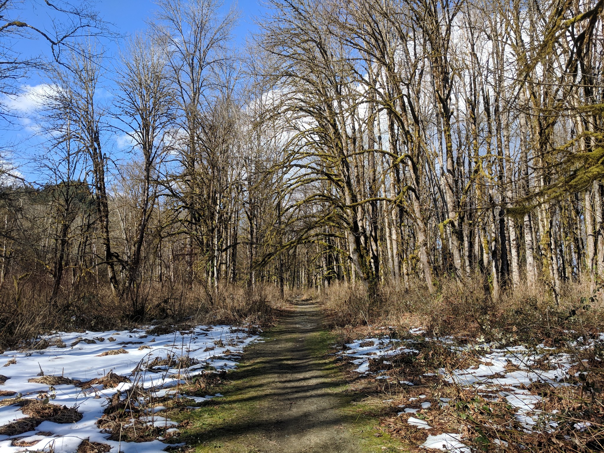 Snow sprinkles along he Lower South Fork Skokomish River trail. Photo by trip reporter Wendy W.