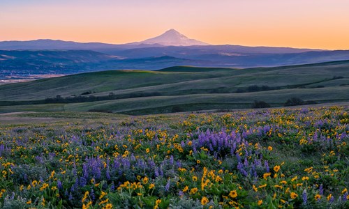 Bottom Line: Spectacular sunset ramble from The Dalles Mountain Ranch trailhead in Columbia Hills Historical State Park, with profuse balsamroot and lupine, rolling green hills, and distance ...