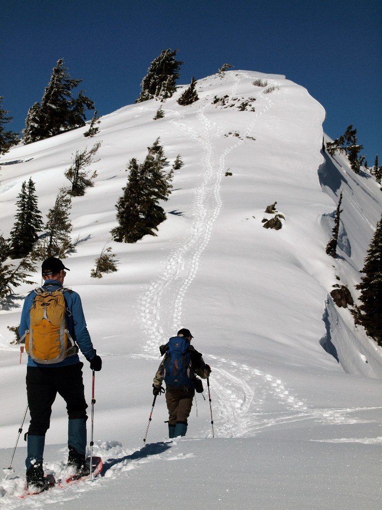 On a beautiful, clear day this is a great snowshoe for scenery and the experience of hiking in some good, dry snow. There is a bit of work involved in that there are a lot of gains and losses in some steep short climbs on the way, both coming and going. The last mile or so back to the trailhead has a steady gain up. There are cornices along the north side of the ridge trail to avoid, but there is room along the ridge to hike and avoid being near them.