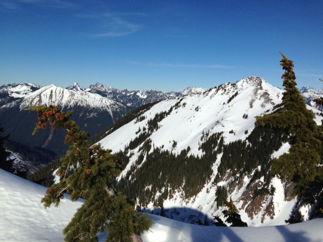 Our lunchtime view down to the lake was stunning, north to Stuart, south to Rainier, and west to Silver and Tinkham.